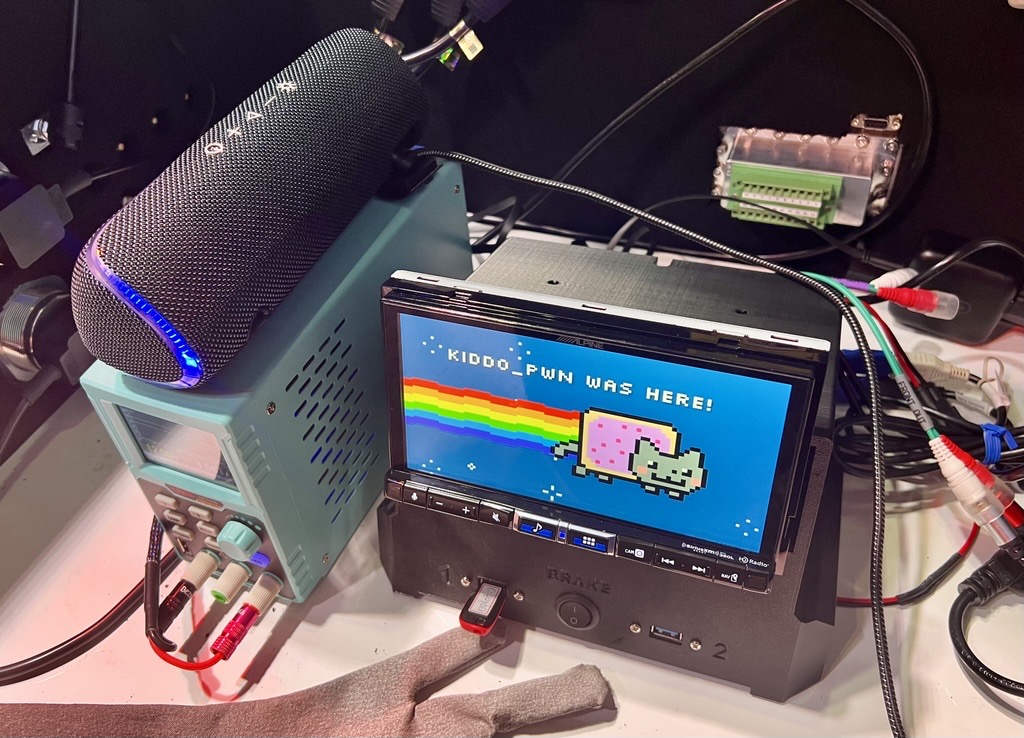 The final exploit of the day offered a mix of the new and the familiar — a sense of déjà vu, if you will. Bongeun Koo of STEALIEN Inc. leveraged a vulnerability in the Alpine iLX-507 IVI system, but the bug had already been discovered last year. Under ISO/SAE 21434, the vendor classified the vulnerability as “sharing the risk,” indicating a decision to accept the residual risk, and chose to not release a patch. The STEALIEN researcher, however, earned priceless style points by displaying the iconic Nyan Cat on the device.