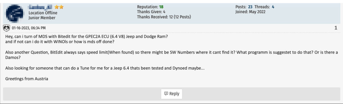 Figure 1. A post on a car modders’ forum by a user requesting help to remove the speed limit of a particular car