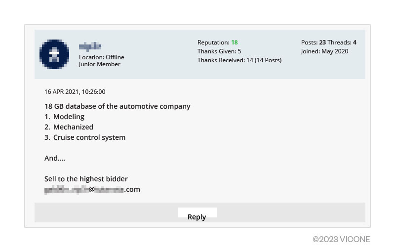 Figure 3. A post on a cybercriminal underground forum by a user offering a data dump from an OEM (recreated as the post has been taken down)
