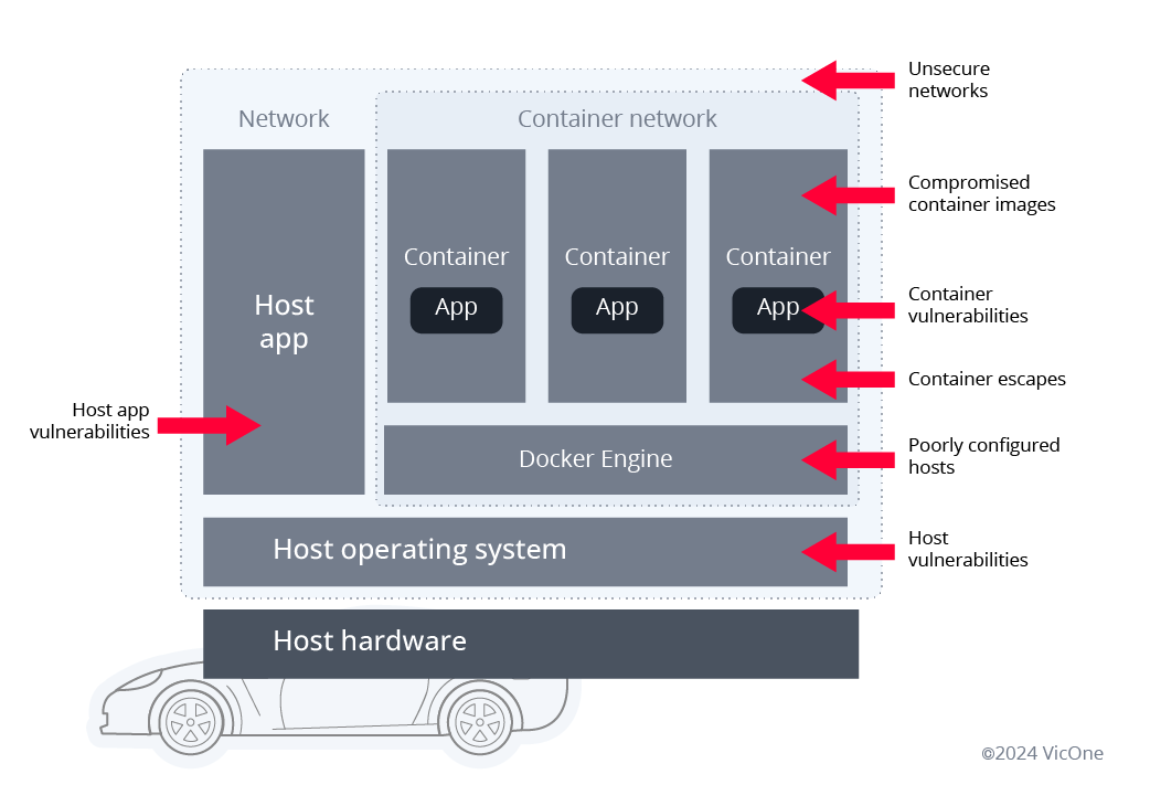 If containers are compromised, attackers could gain escalated privileges, which they could leverage to steal personally identifiable information (PII) or even manipulate vehicle functions. As a result, many developers have recognized the importance of properly addressing the security issues of containers themselves. In some designs, additional layers of protection, such as using virtual machines (VMs), are implemented to further enhance isolation between different domains.