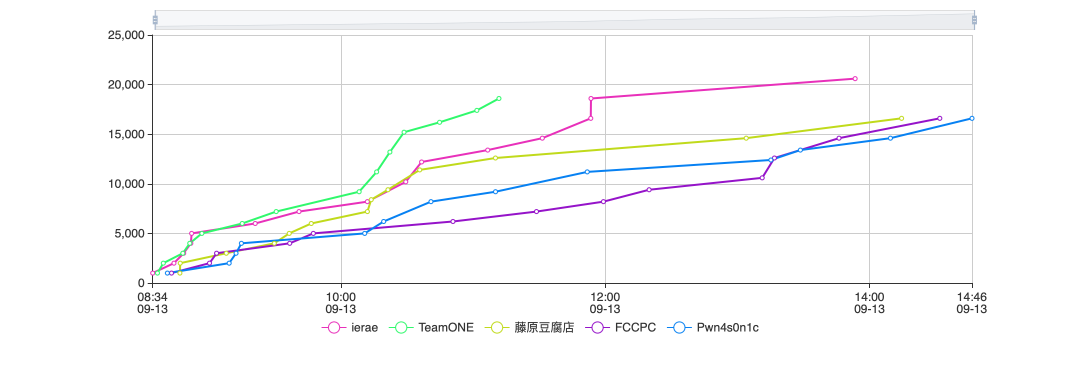 競技は中盤まで、チーム「ierae」と「TeamONE」がともに18,600 ポイントでトップに立っていましたが、他の決勝進出チーム「藤原豆腐店」、「FCCPC」、「Pwn4s0n1c」も得点は大きく離れておらず、混戦状態にありました。