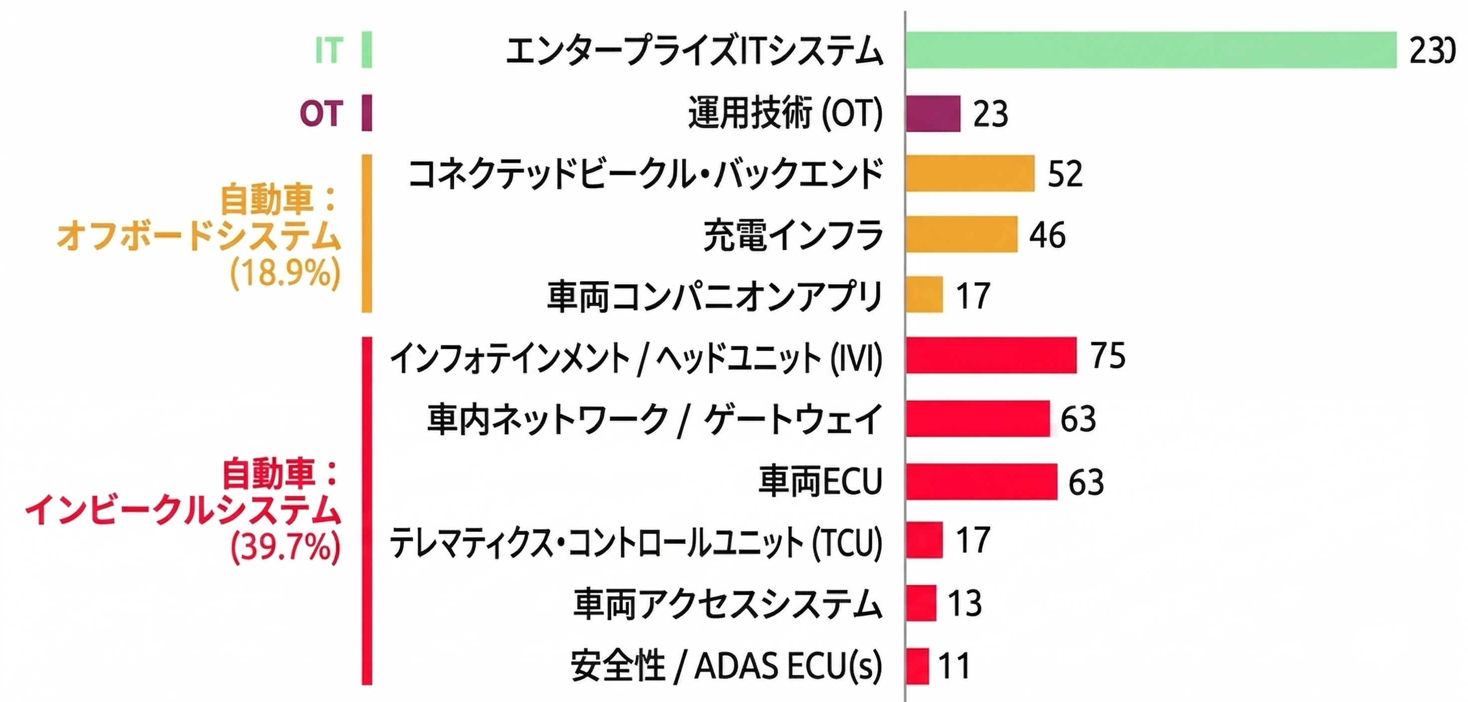 図1. 2025年における攻撃者の標的分布。観測された自動車サイバーセキュリティインシデントのうち約40%を占めた車載システムへの標的