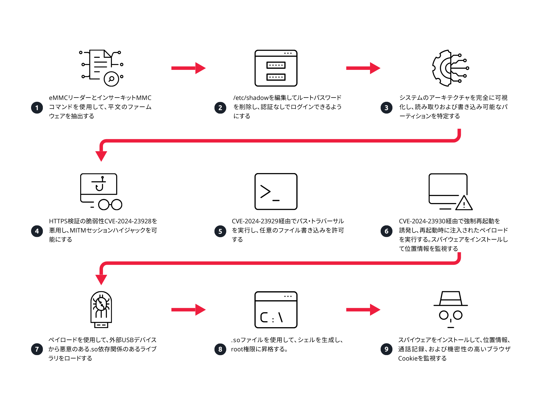 図 1.セキュリティリサーチャーがIVIシステムに常駐型スパイウェアの埋め込みを達成した方法を説明する攻撃の流れ