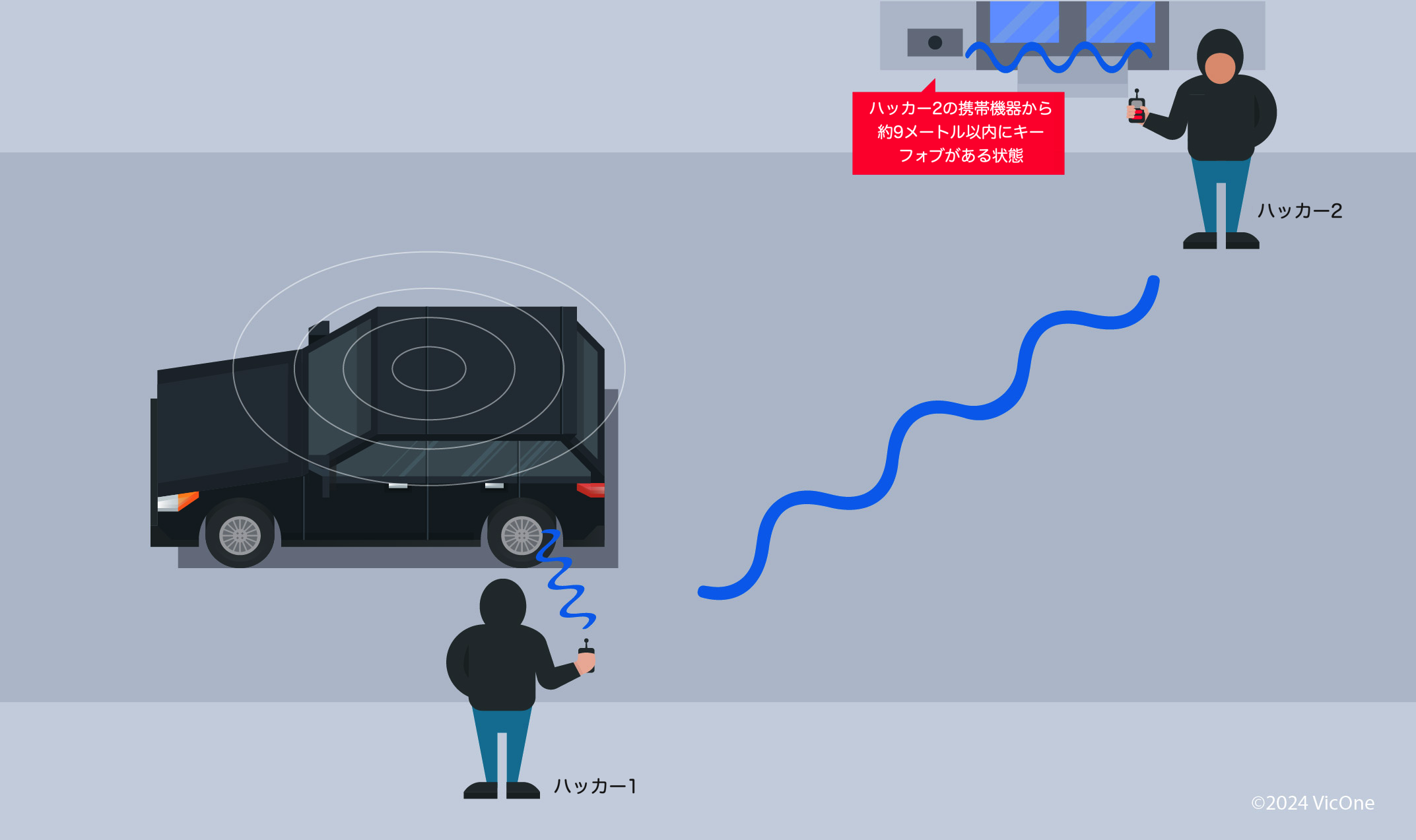 リレー攻撃では、ハッカーは1つの無線デバイスを車の近くに、もう1つを本物のキーの近くに配置します。 これらの無線デバイスは、キーが近くにあると車に信じ込ませ、車のロックを解除して始動できるようにするために、信号を本質的に拡張します。