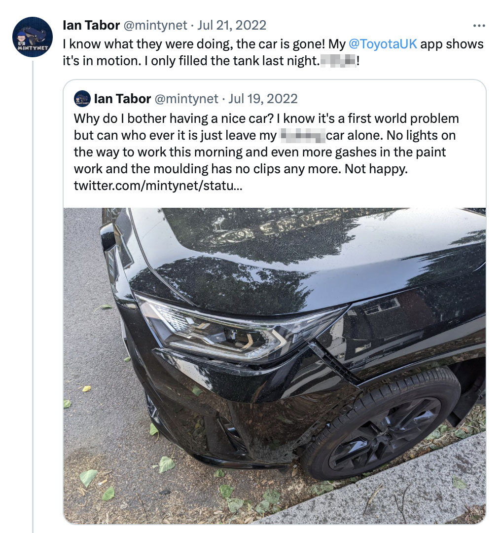 画像1. 車両盗難を報告するIan Tabor氏のツイート