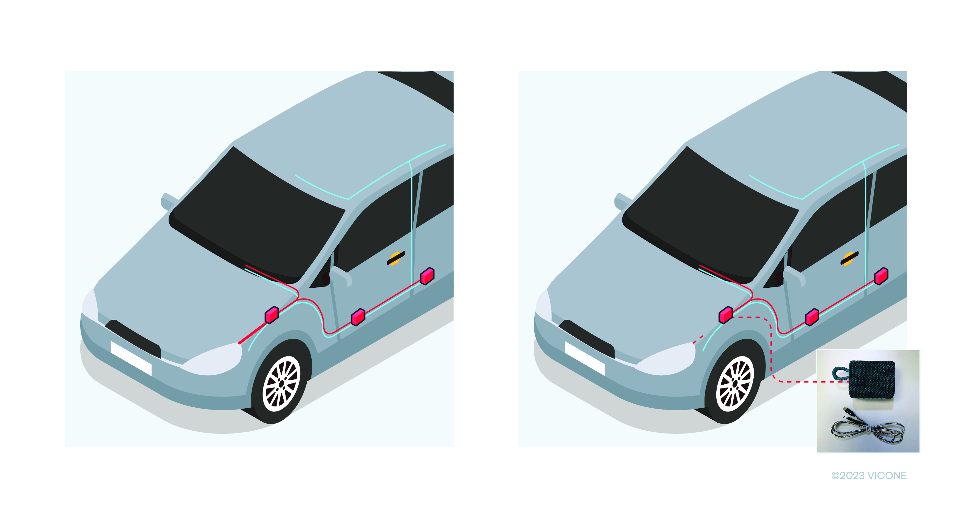 - スマートキー受信機ECUがコネクテッドされているCANバス配線(ヘッドライト経由)にアクセスします。