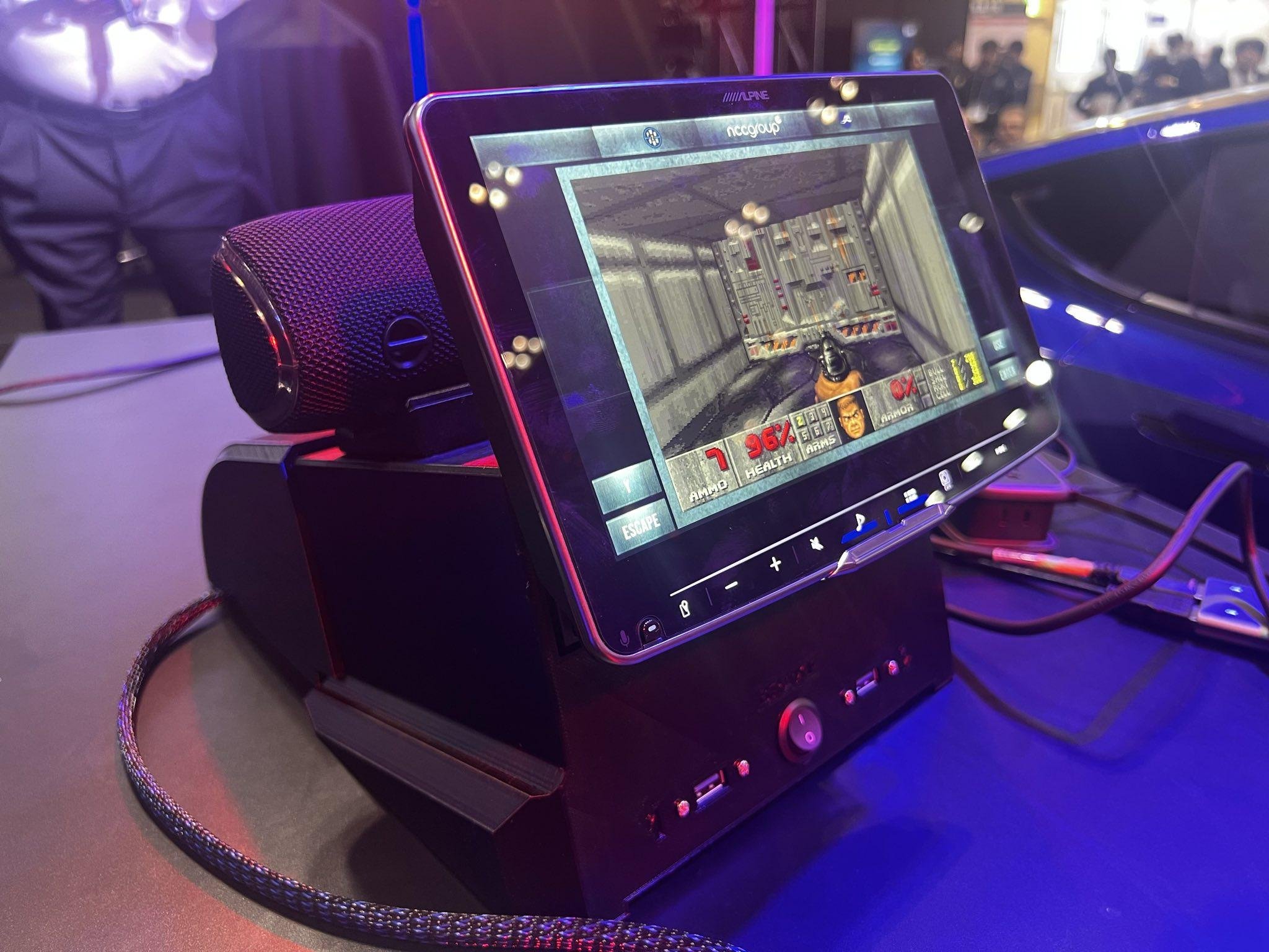 写真1. NCCグループは、Alpine Halo9 iLX-F509 IVIシステムに対して2つのバグチェーンを実行し、その後、そのデバイスで「Doom」をプレイしました。