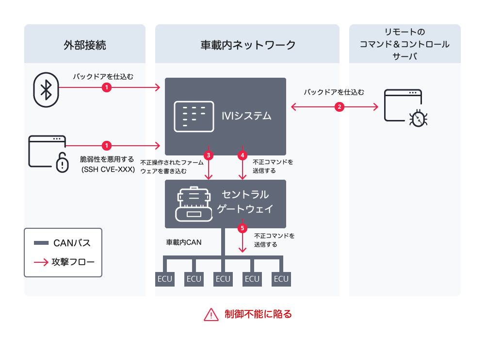2020年に行われた実験的なケーススタディを詳しく見てみましょう。この事例では、リサーチャーたちが不正なコードの組み込みを成功させ、侵害された車載インフォテインメント(IVI)システムが勝手に不正なWi-Fiホットスポットに接続するようになりました。その結果、不正なCANメッセージを送り込み、認証なしで自動車に診断作業をさせることが可能となりました。