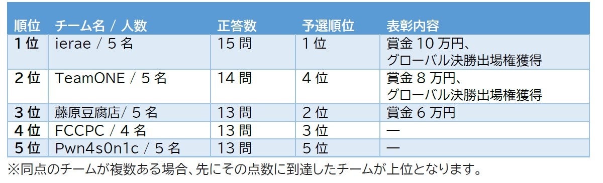 熾烈なスコア争いが繰り広げられた結果、予選を1位で通過した、チーム「ierae」が決勝でも見事1位となりました。第2位は予選順位4位の「TeamONE」が勝ち取り、両チームが10月に米国で開催されるグローバルでの決勝、「Automotive CTF 2024 決勝」への出場権を獲得しました。