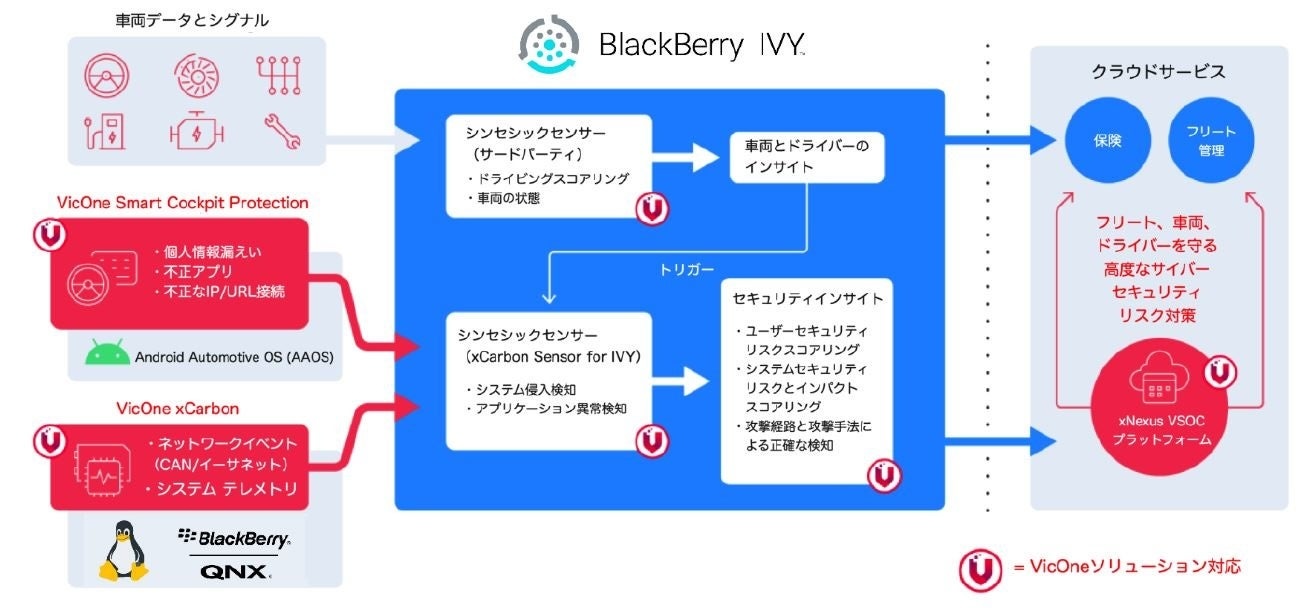 BlackBerry Limitedが提供する車載ソフトウェアプラットフォームの「BlackBerry IVY(ブラックベリーアイビー)」とVicOneによる統合型のソリューションは、車載データを用いたリアルタイム分析を介してサイバー脅威を正確に検出します。