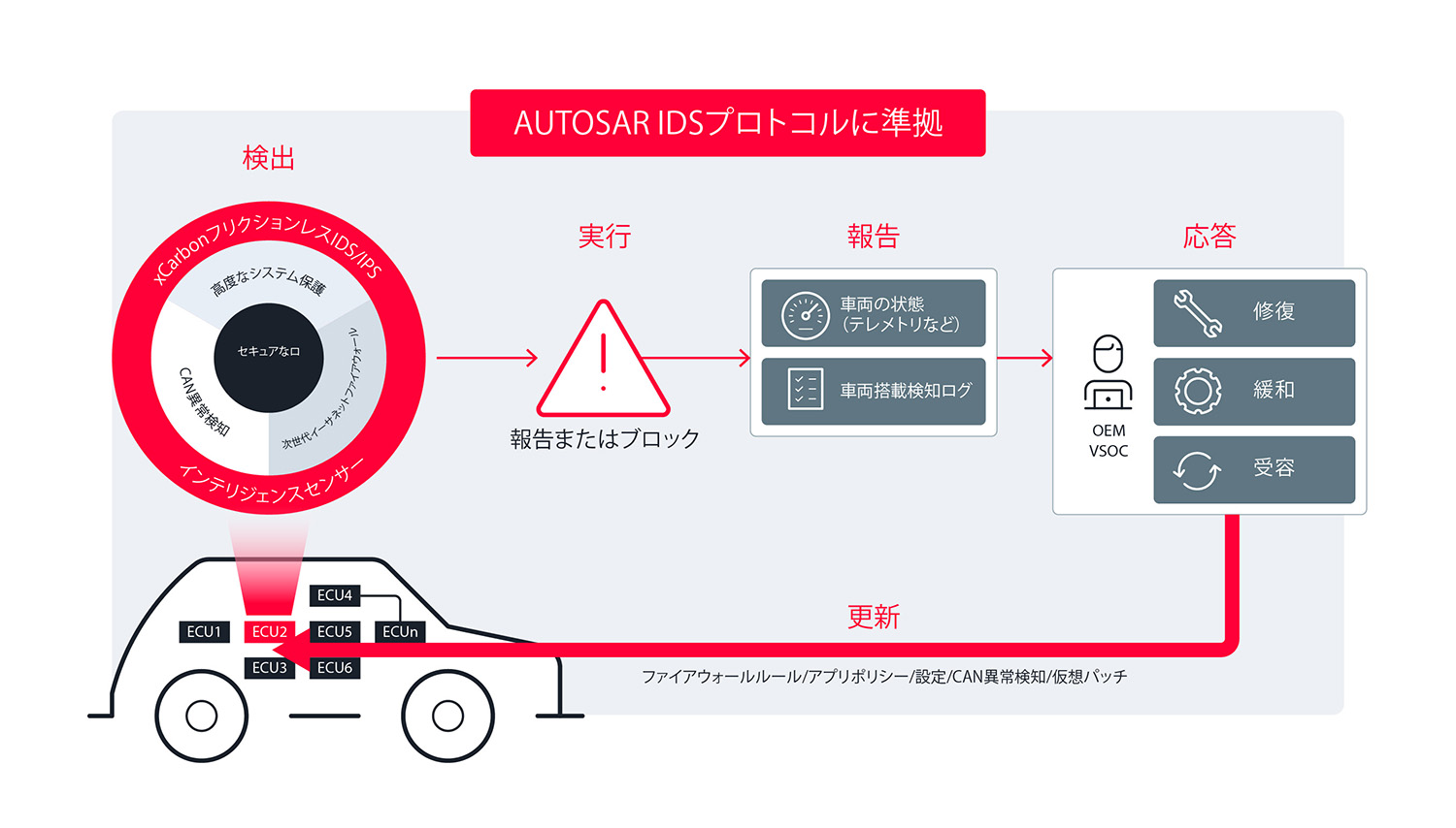 - 高度なシステム保護:当社のホストベースIDSは異常なシステム活動を検出し、システムの完全性を守り、ECUやサービス指向アーキテクチャ(SOA)上での不正なアプリケーション実行をブロックします。