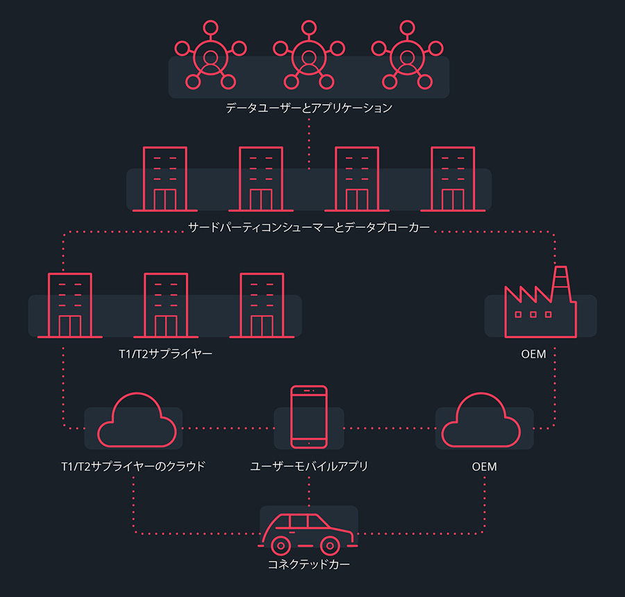 自動車データエコシステムは、データの流れによって結ばれた自動車産業のさまざまな構成要素によって形成される広大なネットワークです。これには車両、自動車メーカー(OEM)、ティア1(T1)およびティア2(T2)サプライヤー、データブローカー、そしてデータの使用者が含まれます。OEMやT1/T2サプライヤーにとどまらず、消費者、サードパーティのサービス提供者、新しいアプリケーションや製品など、より広範な分野に及んでいます。