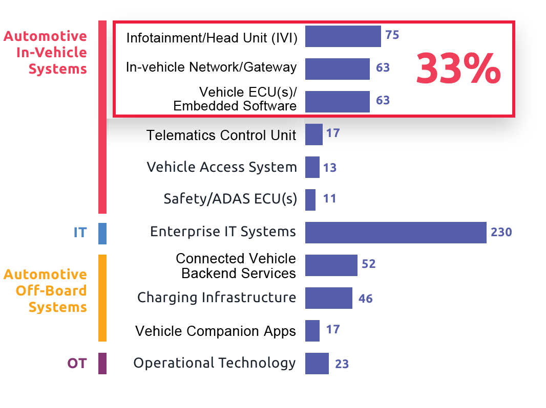 In-vehicle systems have emerged as the primary target, accounting for nearly 40% of observed attacks. These are the systems drivers interact with every day.