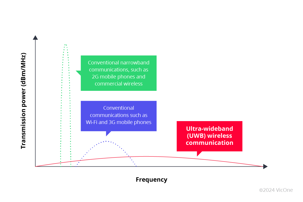 Conventional narrowband communications (e.g., 2G mobile phones) and conventional communications (e.g., Wi-Fi and 3G mobile) operate at higher power levels over narrower bands. UWB wireless communication spans a wide frequency range with significantly lower transmission power.