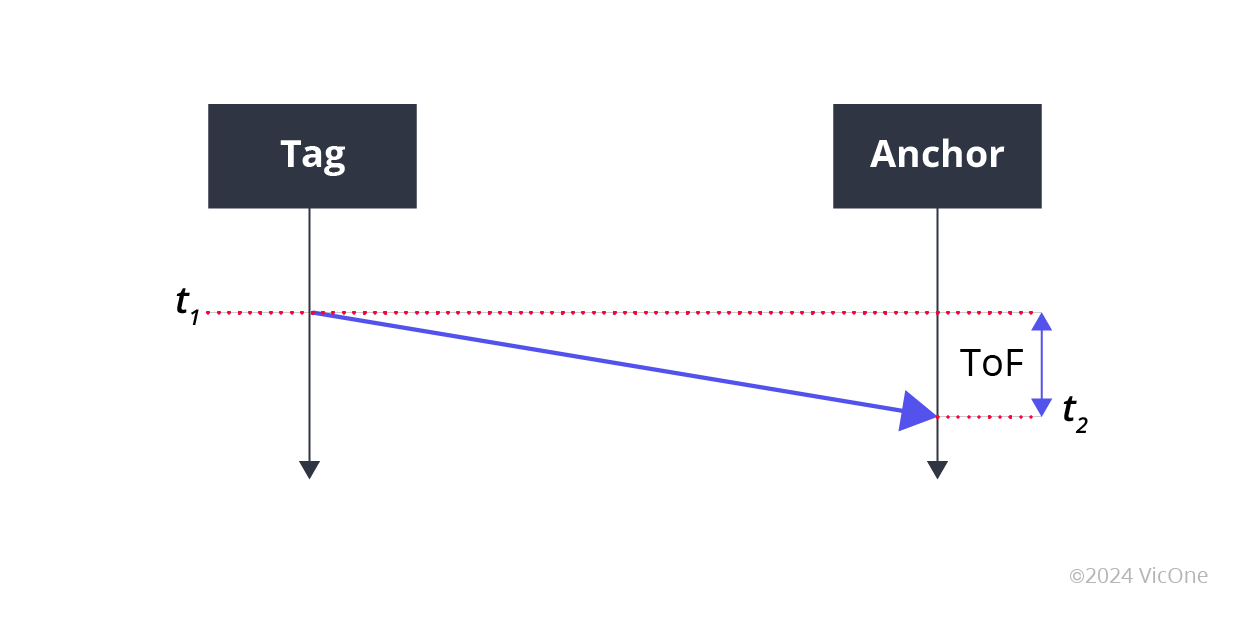 For ToF, the tag transmits a UWB frame as payload, the time at which the frame is sent (t1). The anchor receives the frame at t2 and calculates the ToF as t2 − t1.