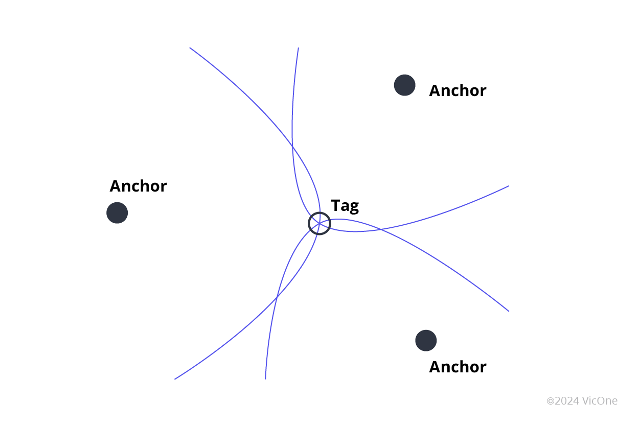 For TDoA localization, the tag transmits a signal that reaches each anchor at different times because of the varying distances between the tag and the anchors. By measuring the time differences between when the signal arrives at pairs of anchors, a hyperbola can be calculated. The location of the tag is determined by finding the intersection point of at least three such hyperbolas.
