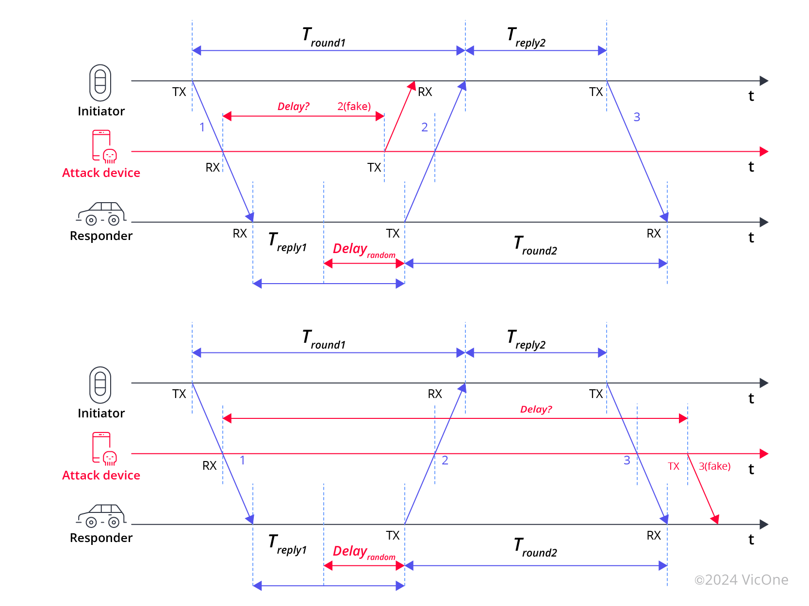 Attacks such as UWB accurate deafening can be successfully executed mainly because the timings of the messages can be easily predicted. To mitigate these attacks, a random delay can be introduced between the signal received and the signal transmitted. In this way, only the initiator and the responder can expect authentic messages from each other, while messages sent by an attacker will be out of the designed time frame and thus neglected. As illustrated in the diagrams in Figure 8, if the response time is unpredictable to the attacker, the attacker will send the messages either sooner or later than the authentic ones.