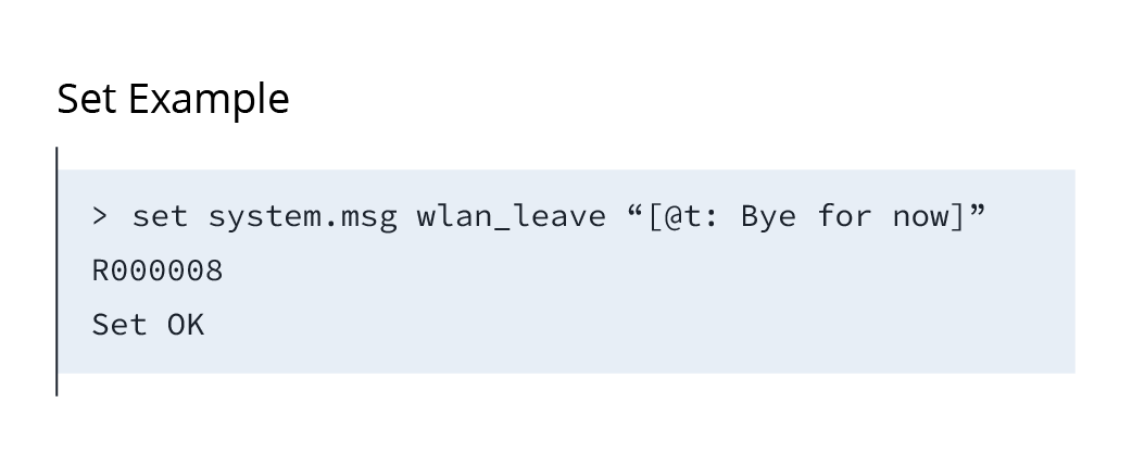 When the message format is set using multiple tags, such as by typing the command Set system.msg wlan_leave "[@t@t@t@t@t@t…]", it will cause the message to overflow the output buffer — a classic stack-based buffer overflow vulnerability.