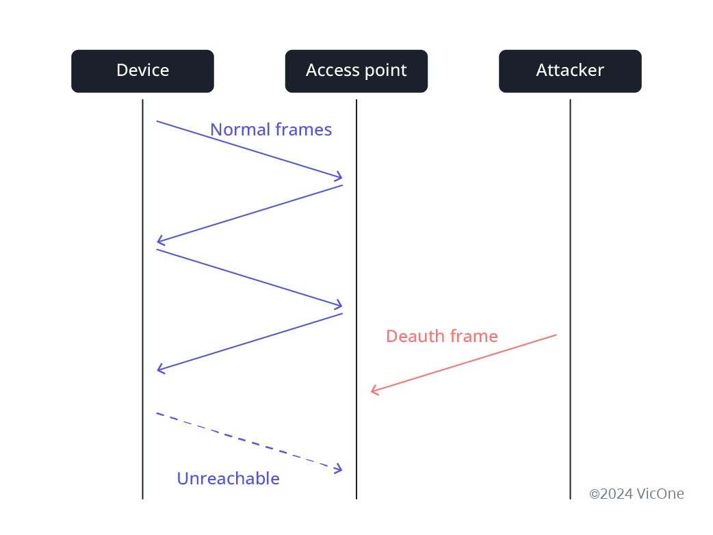 A deauth attack involves an attacker impersonating a station and sending “I’m going offline” to its access point. The attacker spoofs the target device’s basic service set identifier (BSSID) and sends a deauthentication frame to the access point (AP). This causes the device to disconnect from the AP and attempt to reconnect.