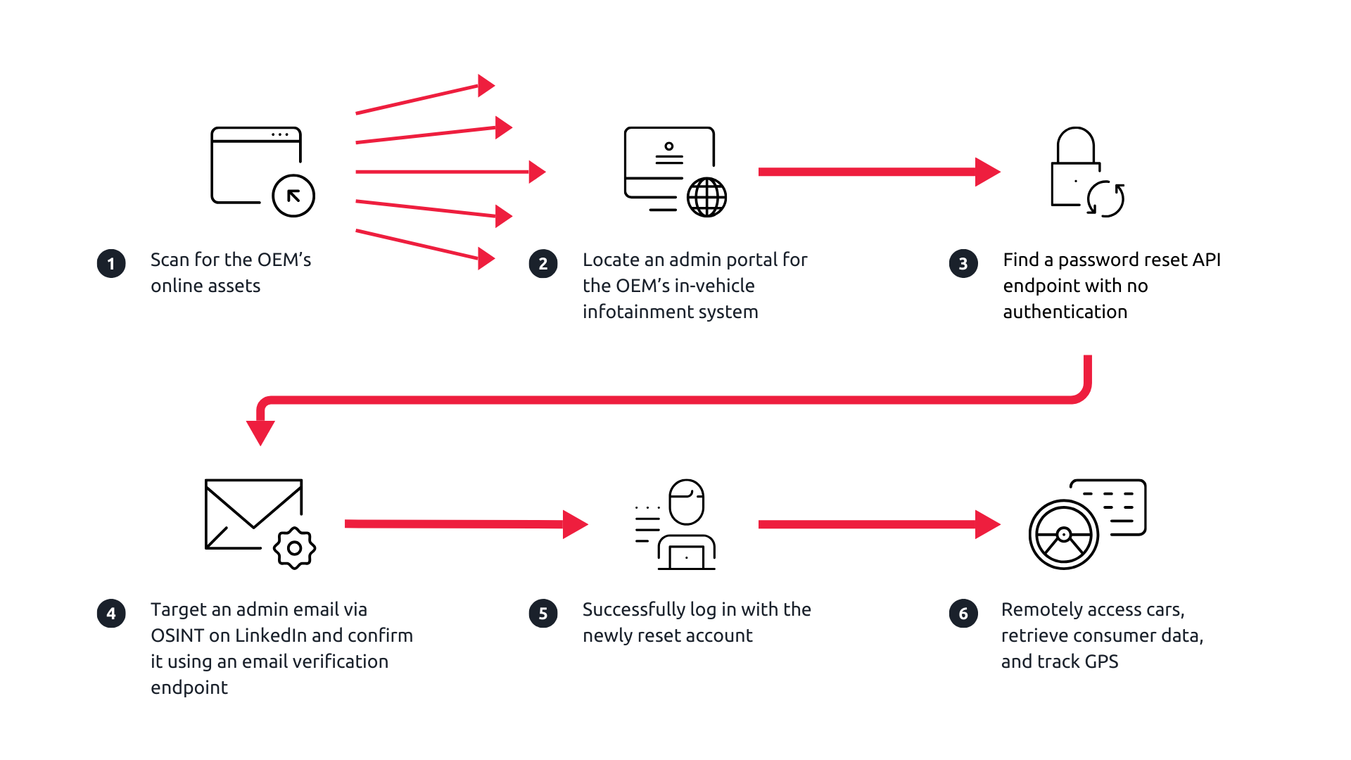 圖一:攻擊流程圖,顯示研究人員如何一步步取得 Subaru Starlink IVI 系統的完整管理員存取權限。