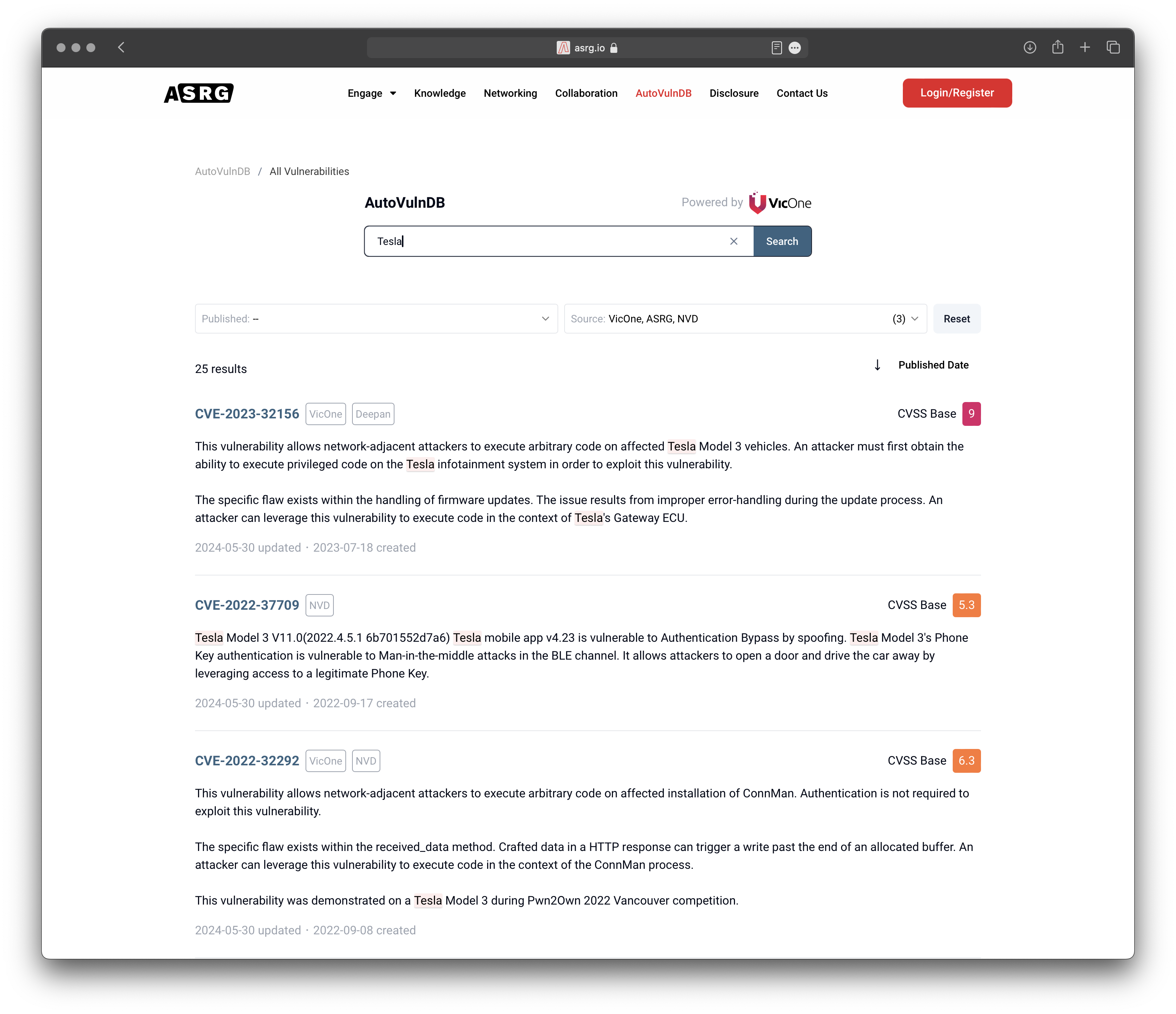 Figure 1. AutoVulnDB, a database from VicOne and ASRG aimed at helping automotive OEMs, suppliers, and other industry players discover and fix automotive vulnerabilities