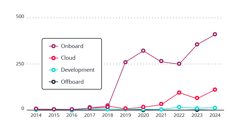 Our research highlights a correlation between documented Common Vulnerabilities and Exposures (CVEs) and real-world automotive cybersecurity incidents, particularly those involving vehicle hijacking. In 2024, vehicle hijacking threats were the second most prominent incidents recorded. These incidents primarily stemmed from onboard system vulnerabilities, which accounted for over three quarters of automotive vulnerabilities published last year.
