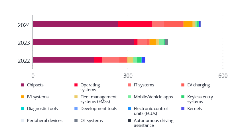 Figure 4. Distribution of automotive vulnerabilities published each year from 2022 to 2024 by affected system or component