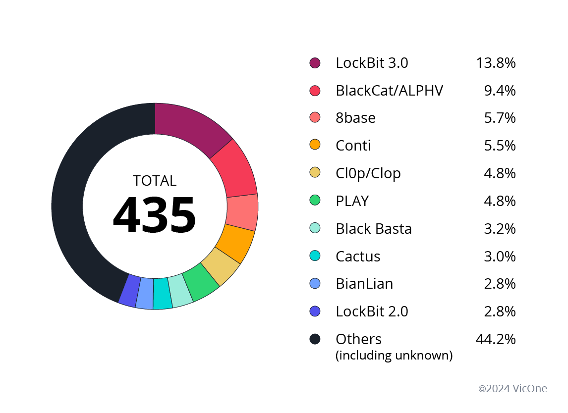 The top three ransomware families in 2023 were notorious ones: Lockbit 3.0 (13.8%), BlackCat/ALPHV (9.4%), and Cl0p (4.8%). Lockbit 3.0 led to numerous victims, until 2024, when law enforcement significantly disrupted its operations through Operation Cronos. The Russian-speaking ransomware group BlackCat/ALPHV, known for using advanced extortion methods, had a significant impact in the US. Cl0p accelerated its operations by using a vulnerability in the transfer software MOVEit, resulting in thousands of victims, including those in the automotive industry.