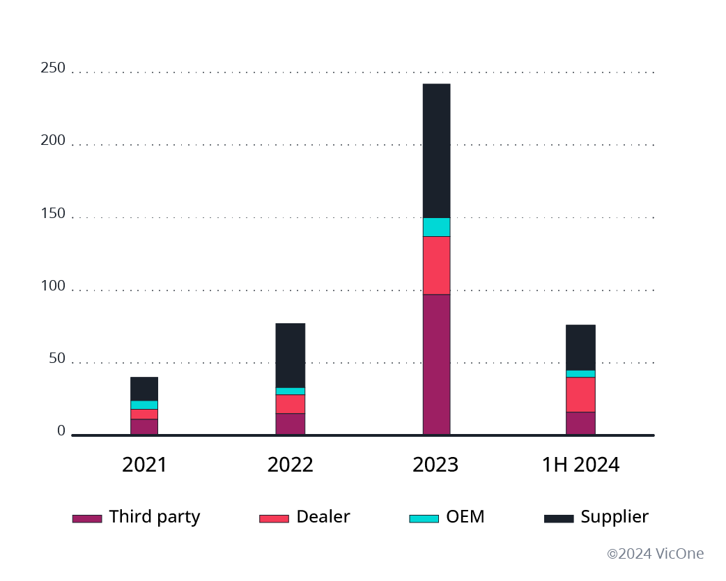 Figure 2. The number of automotive companies reportedly hit by ransomware attacks from 2021 to the first half of 2024, distributed by supply chain entity