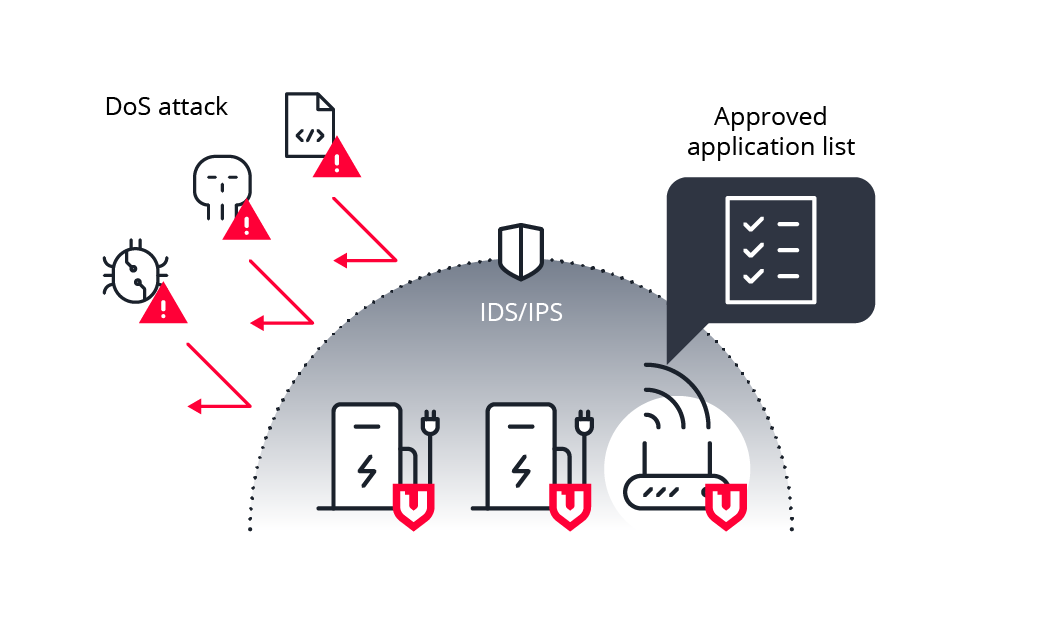 即使您的電動車充電系統已經投入營運,我們的解決方案也能為您帶來優勢。透過提前將我們安全代理軟體整合到您的充電點或控制器中,電動車充電系統就能夠開始執行即時偵測和阻止攻擊,包括阻斷服務 (DoS) 攻擊。它還部署虛擬補丁*,透過實施多層安全性策略和規則來防止漏洞利用。此外,它還透過批准的應用程式清單進行驗證,藉以阻止未經授權的應用程式在充電器上執行。