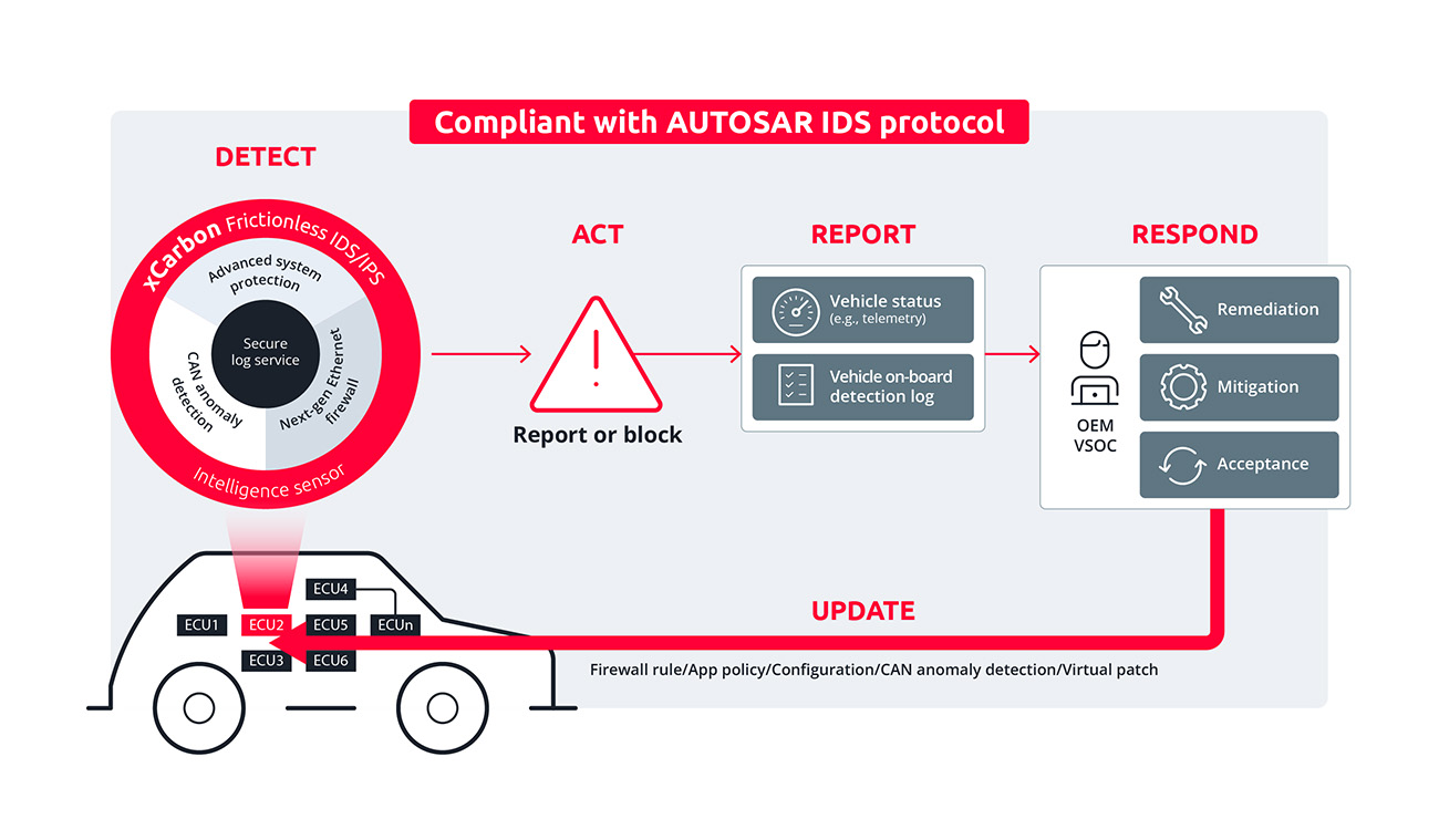 The modern software-defined vehicle (SDV) offers a safer, connected, and autonomous driving experience for the automotive industry. But with millions of lines of code and various connectivity interfaces, an SDV is exposed to an increased number of risks. An IDPS helps vehicle manufacturers fulfill UN R155 requirements for cybersecurity and cybersecurity management systems by detecting and monitoring suspicious activities in electronic control units (ECUs). It also performs real-time protection once a cyberattack is identified and plays a sensor and data aggregator role to communicate with the vehicle security operations center (VSOC) for further data forensics and advanced analysis of threats.
