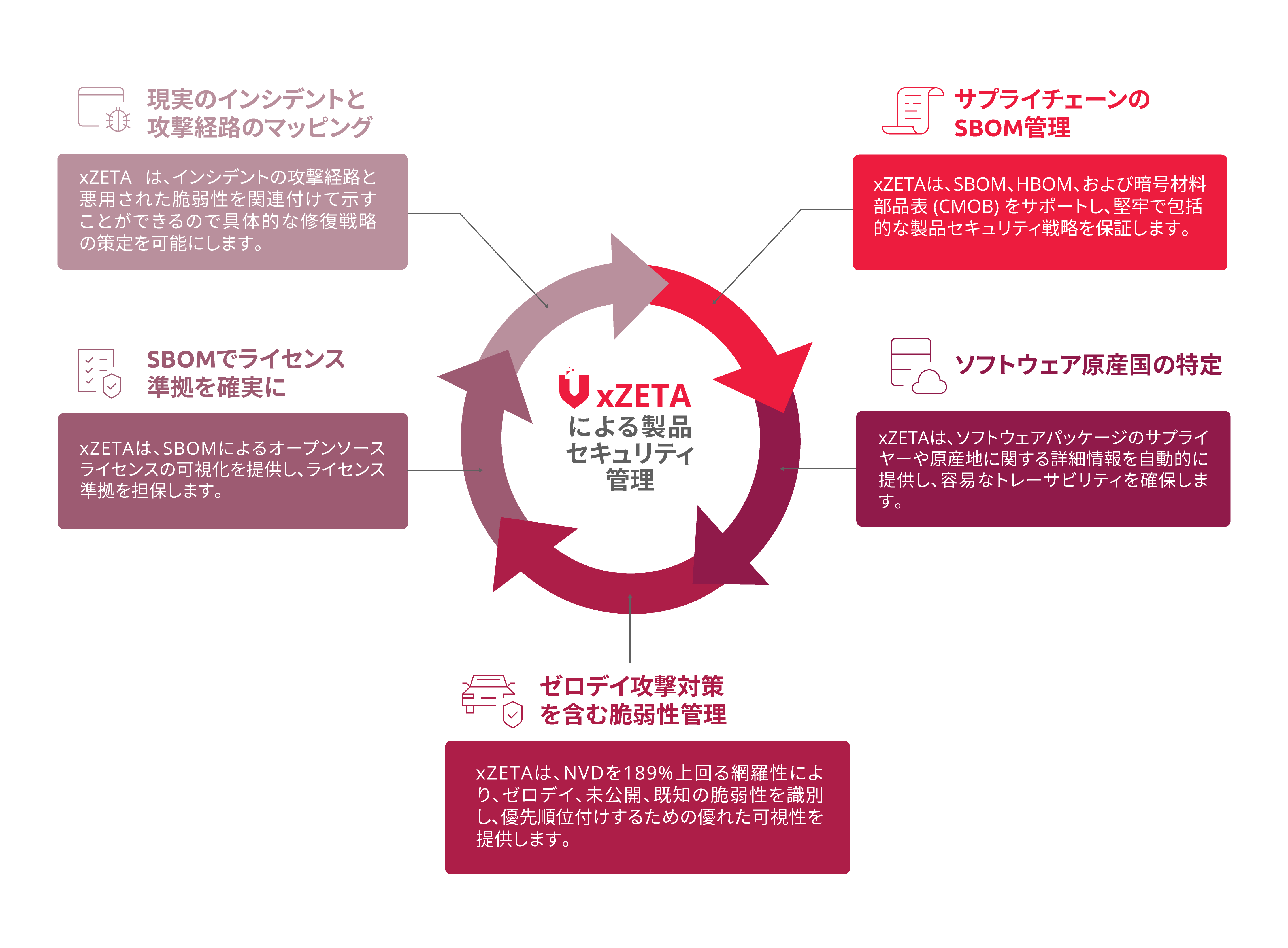 VicOne xZETAは、脆弱性管理、SBOM管理、自動車向け脅威インテリジェンスを統合したプラットフォームです。CRA準拠向けに設計された包括的なソリューションを提供します。自動車に特化したサイバーリスクを軽減し、市場投入までの時間の短縮、欧州市場での信頼の獲得など、お客様のコンプライアンス準拠への道を加速するお手伝いをします。