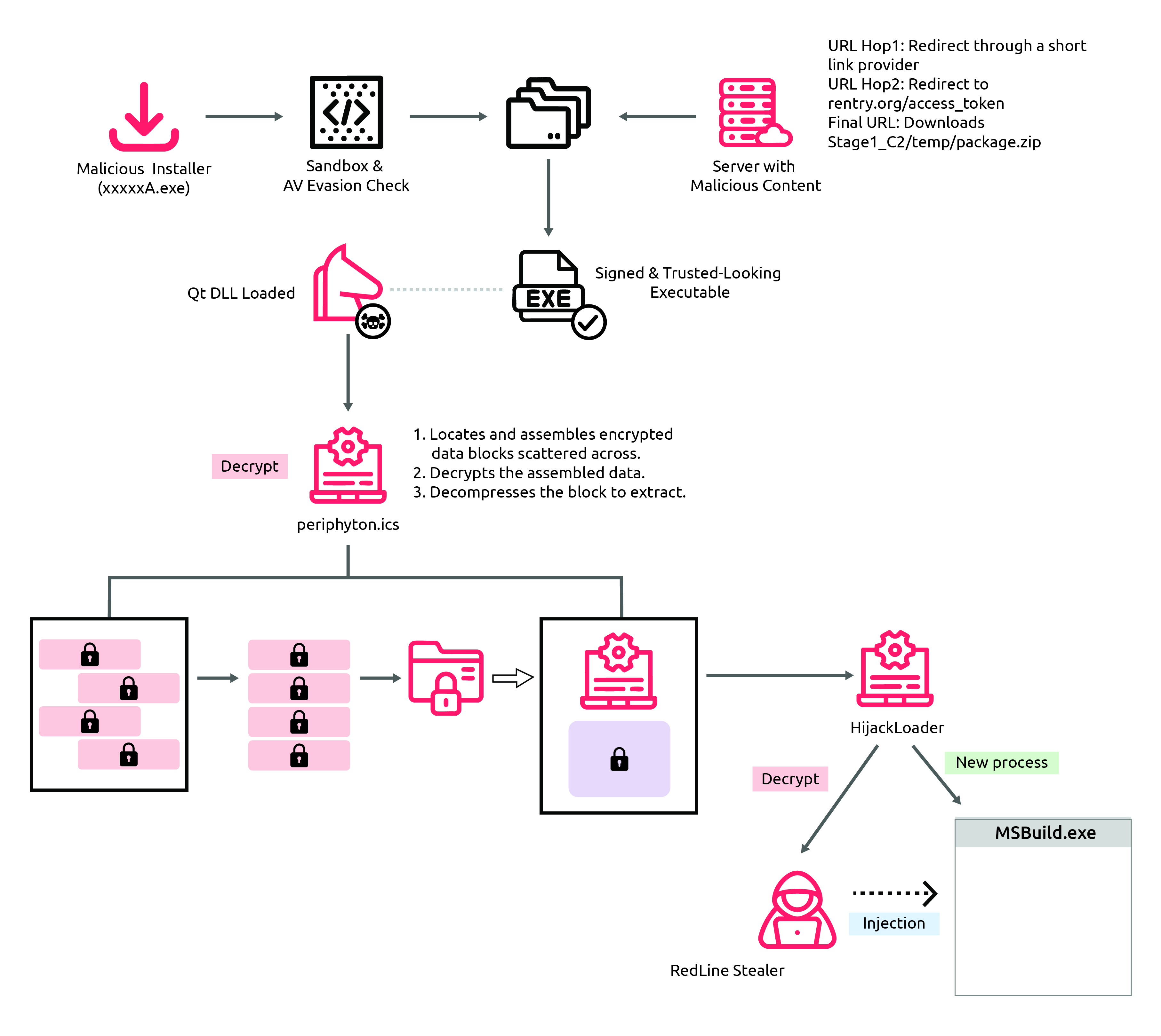 この実行ファイル自体は、単独では明らかに悪意のあるものではありません。しかし、実行されると、ローカルにバンドルされた DLL「QtGuid4.dll」を自動的に読み込みます。このDLLは、サイドカーファイル「periphyton.ics」に格納された暗号化されたブロブを復号化し、メモリ内にシェルコードを直接送信するように改変された武器化されたバージョンに置き換えます。そのシェルコードは、最終的なペイロード「RedLine Stealer」を解凍して注入するステージングコンポーネント「HijackLoader」を起動するのです。