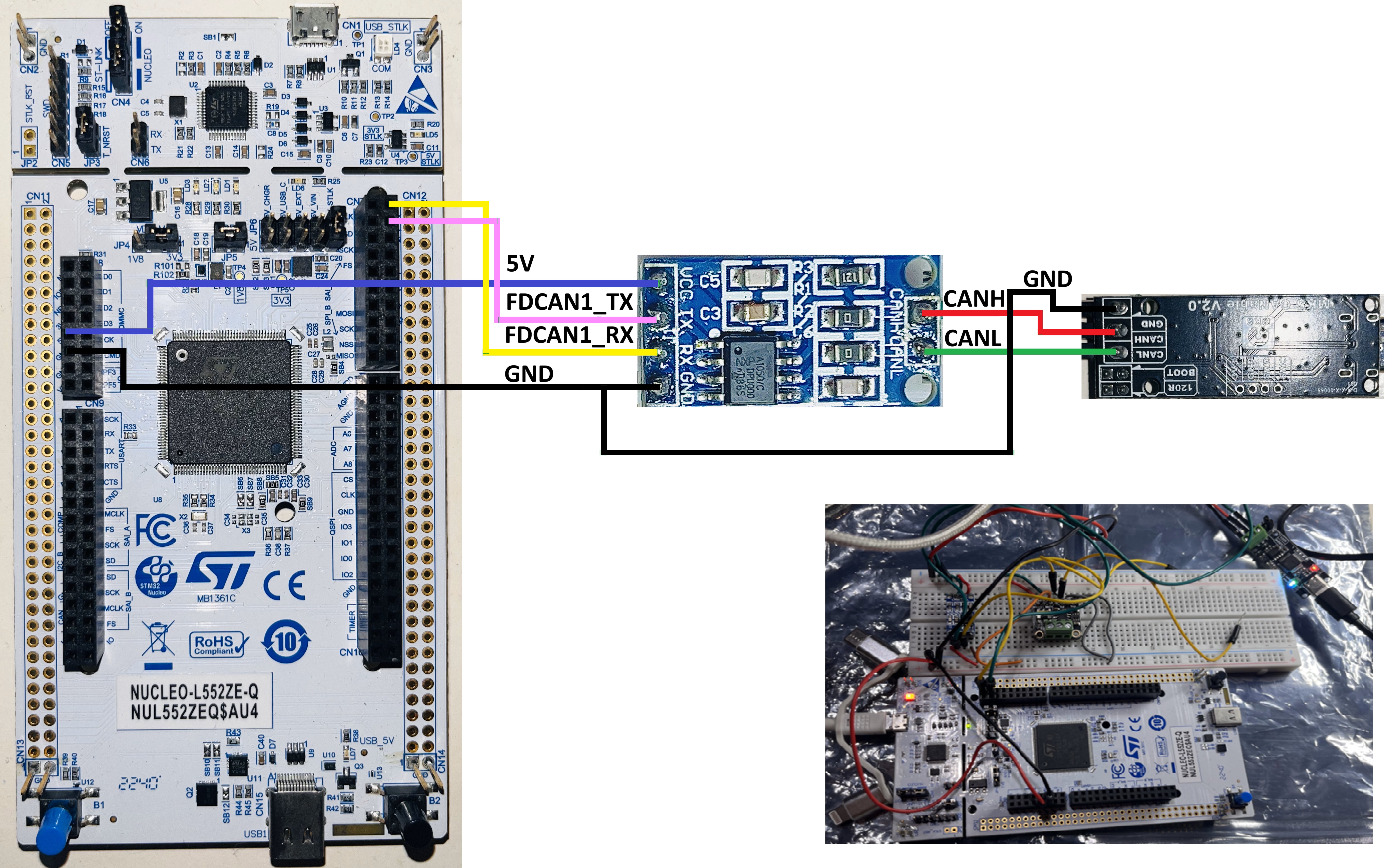 - ボードのセットアップ:STM32ボードをマウントし、追加のペリフェラル(CANトランシーバー・モジュールなど)を接続し、USB接続によって適切な電源が供給されるようにします。