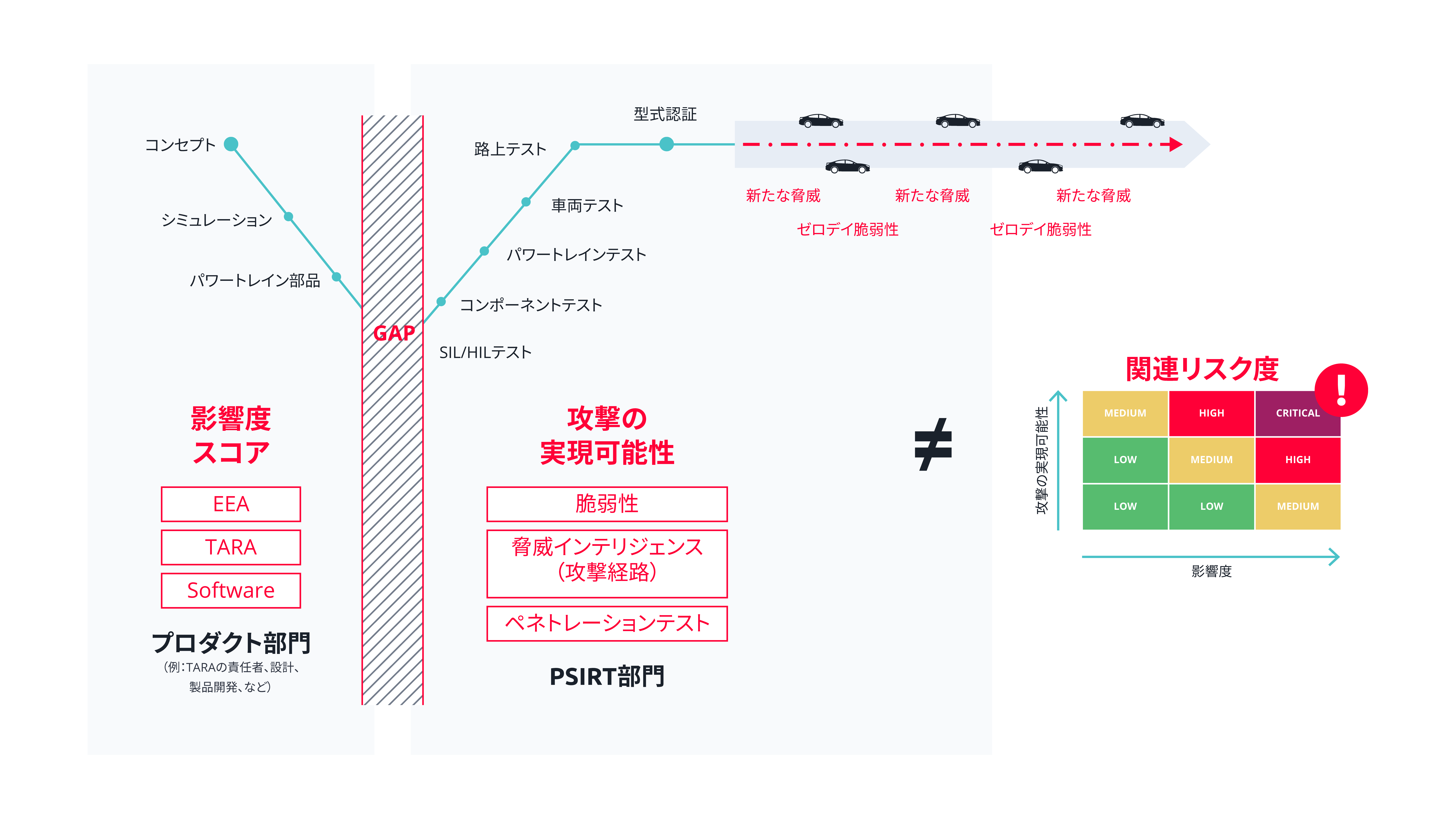 図2. 脆弱性解析とTARAの自動化された動的統合は、PSIRT部門とプロダクト部門間のギャップを埋め、新たな脅威にダイナミックに適応する車両リスク管理を可能にします。